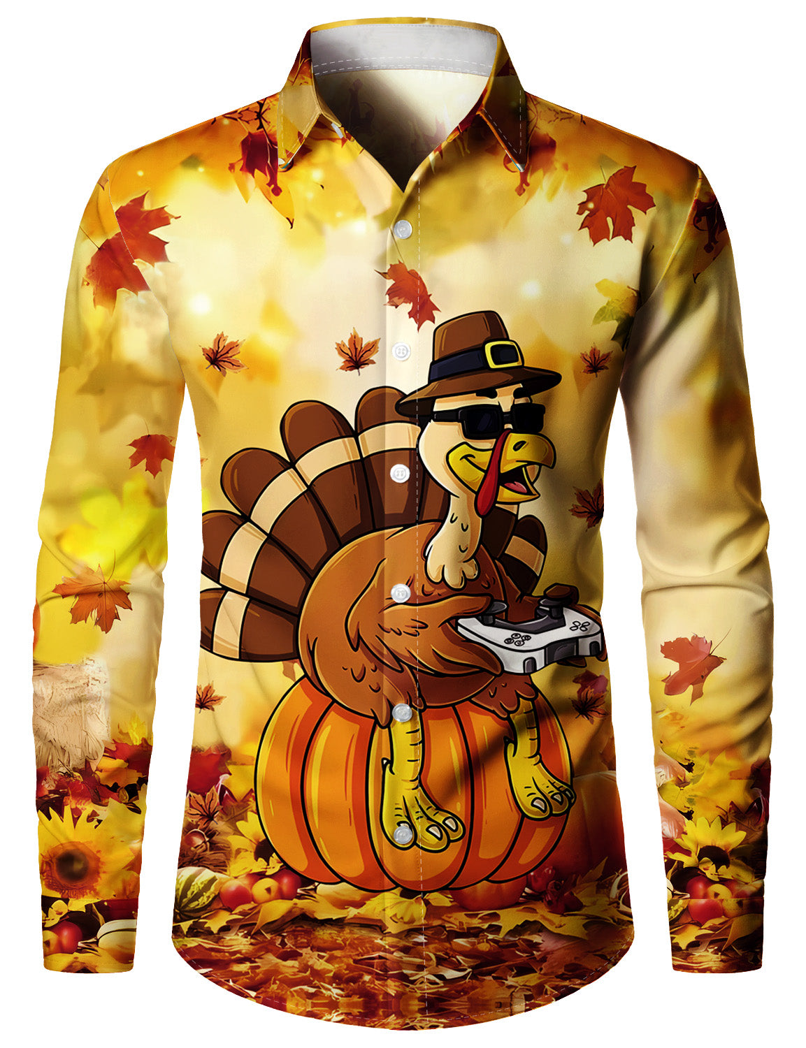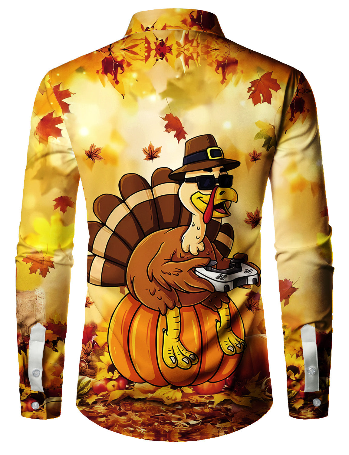 Men's Thanksgiving Cartoon Turkey Playing Games Print Long Sleeve Shirt