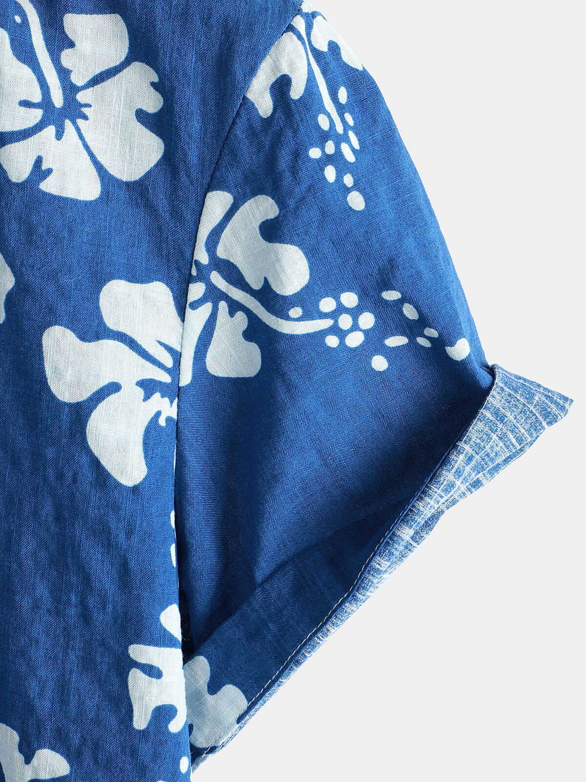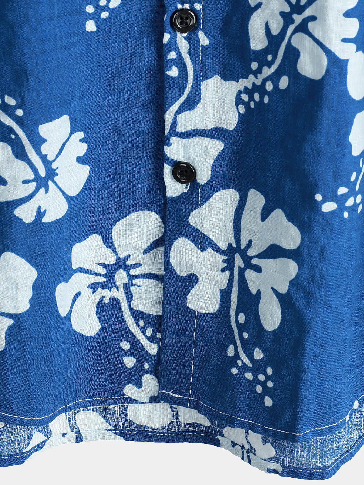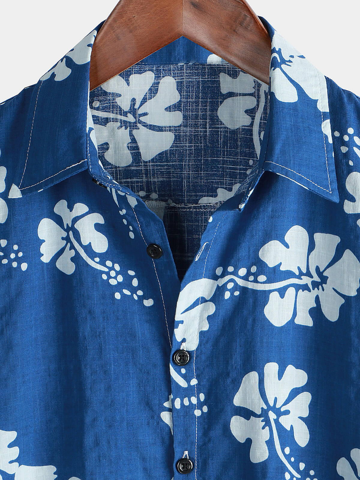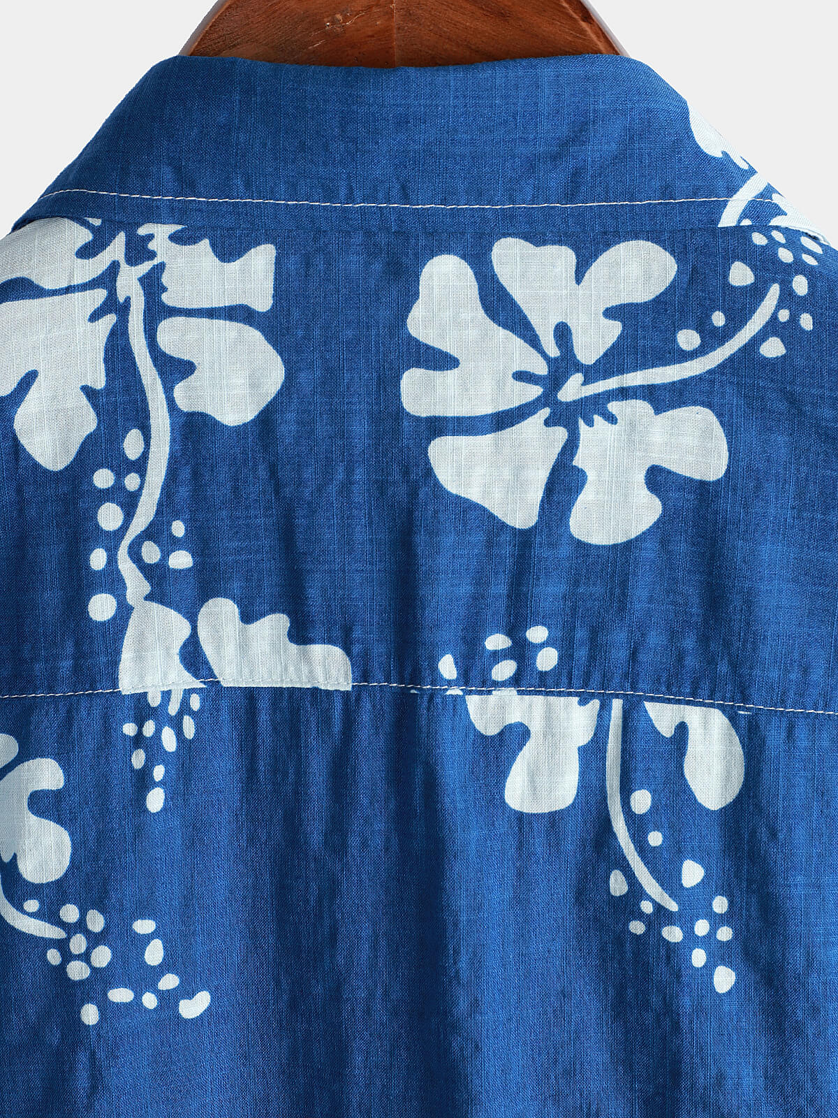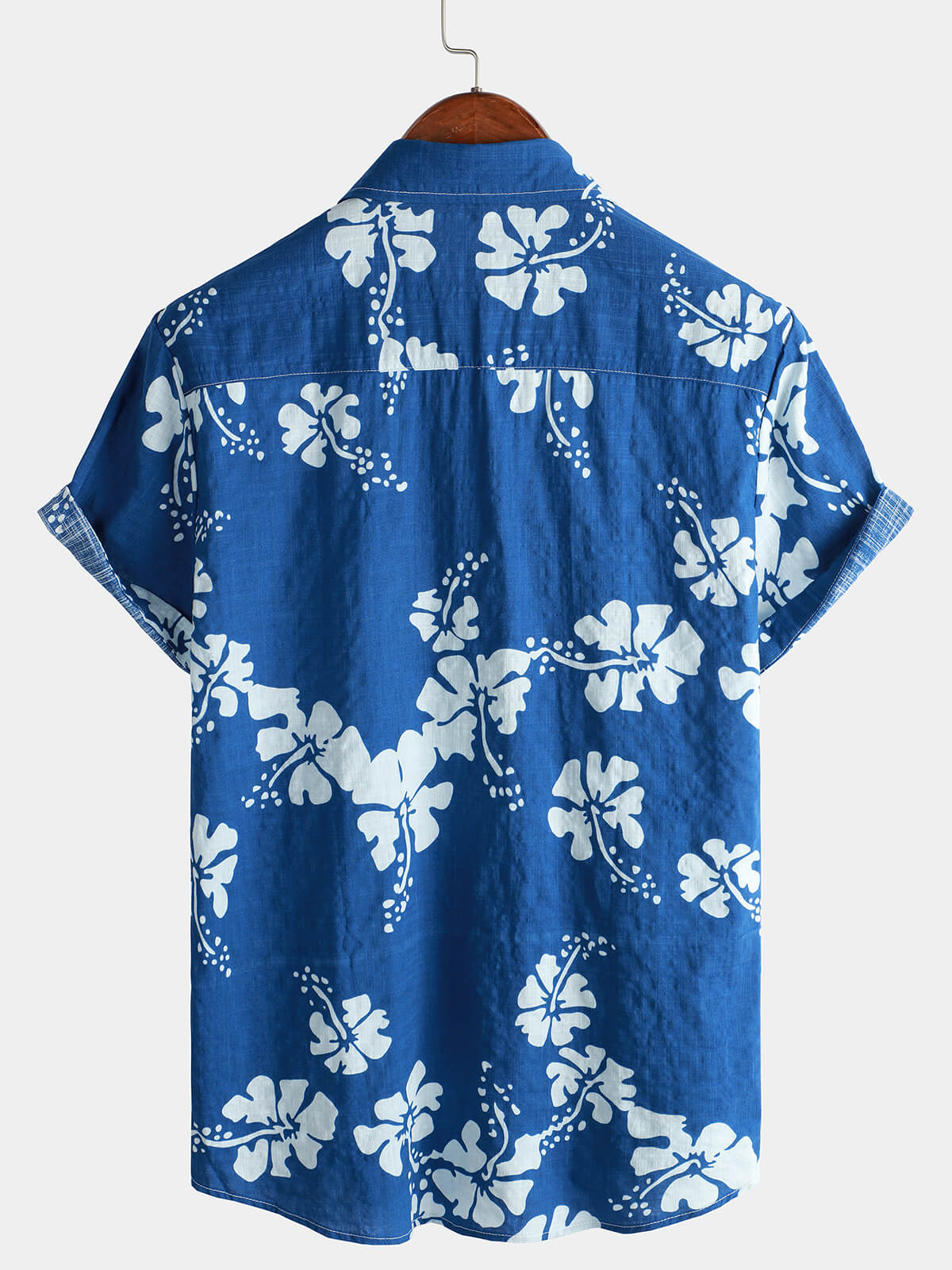 Men's Blue Floral Short Sleeve Beach Tropical Hawaiian Button Up Shirt