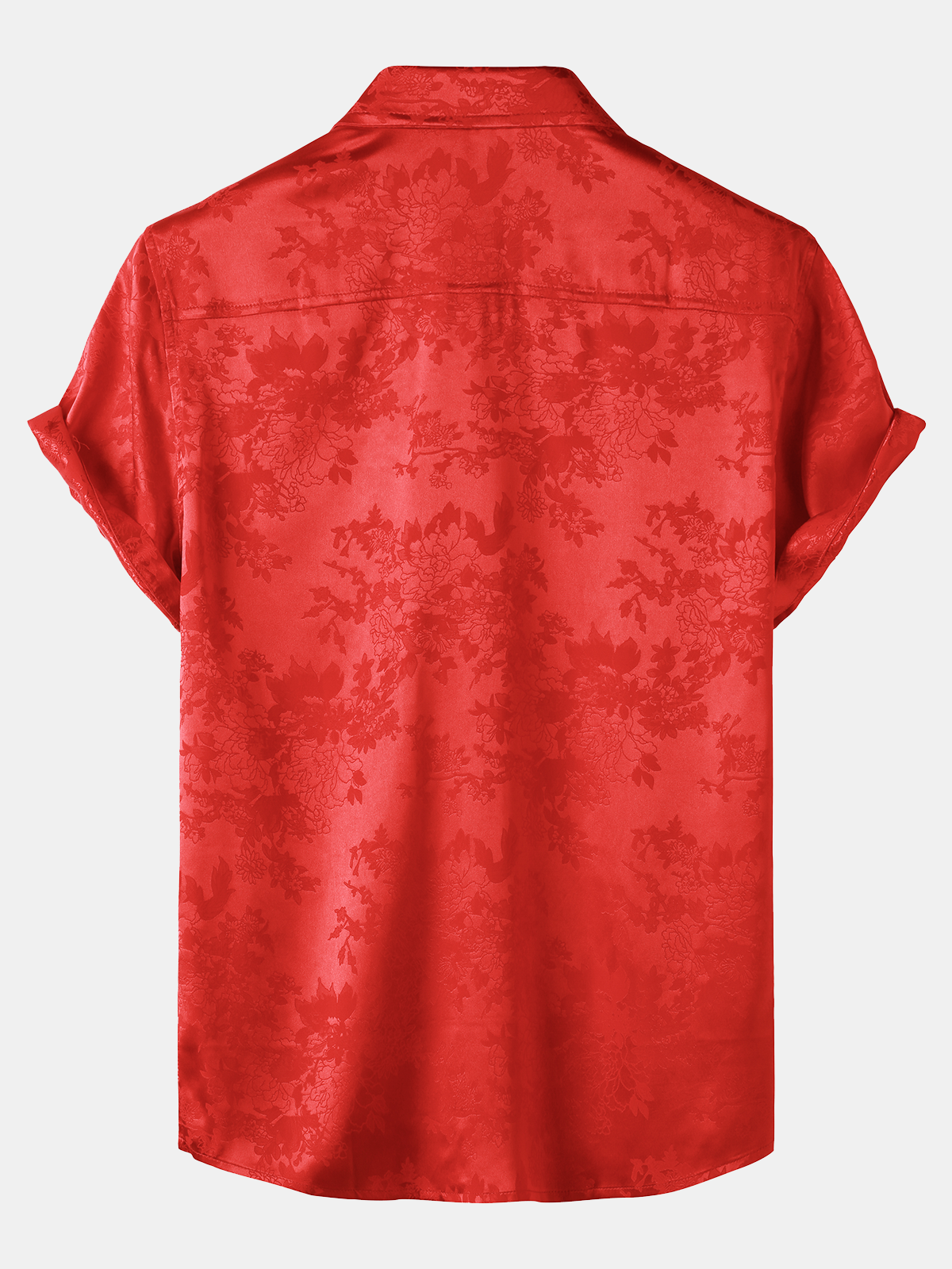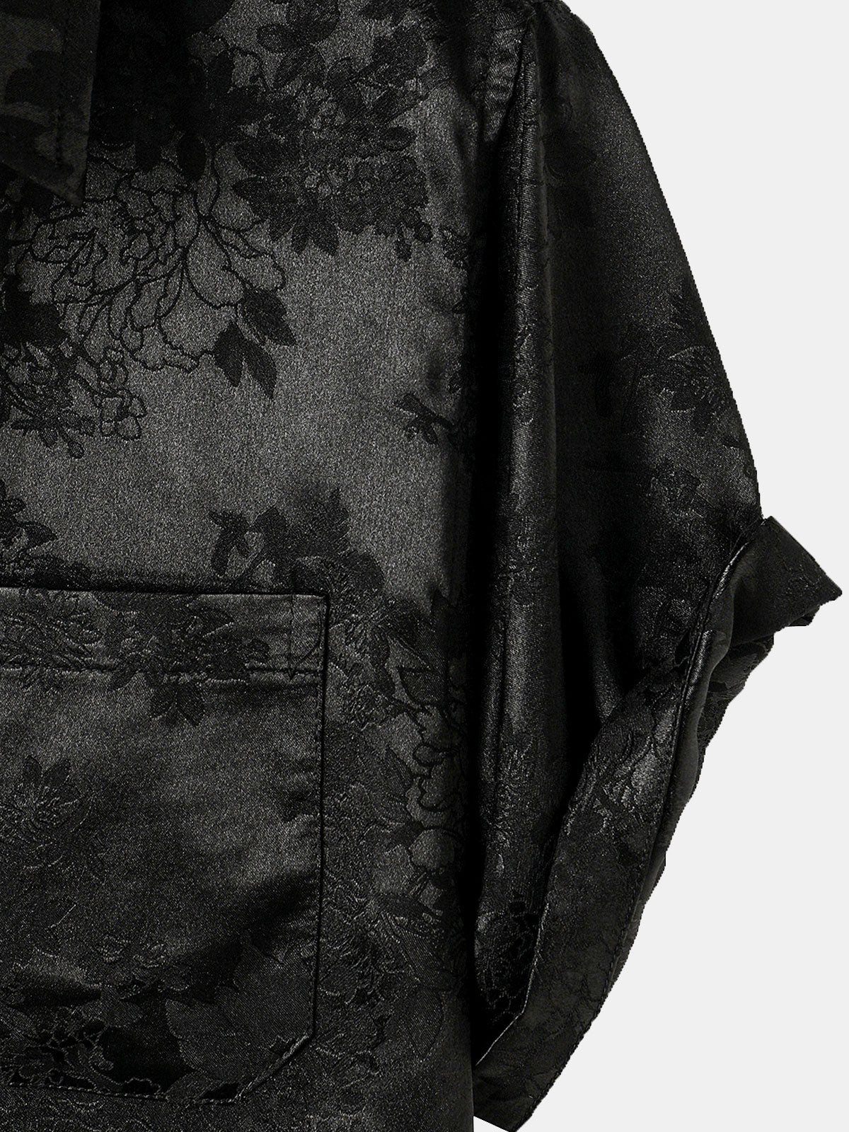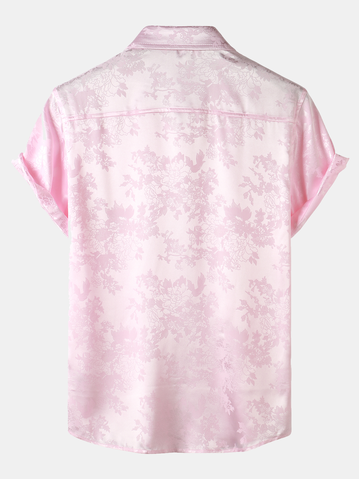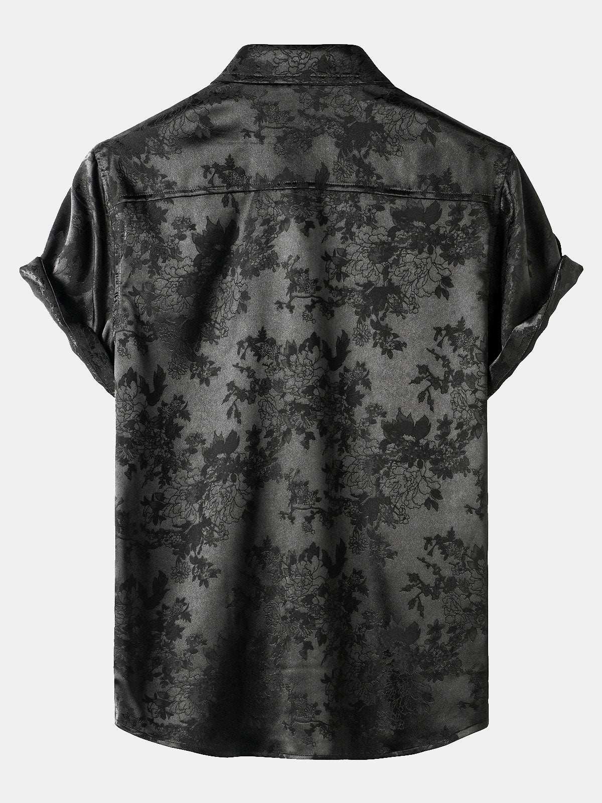 Men's Casual Jacquard Silk Satin Floral Pocket Short Sleeve Shirt