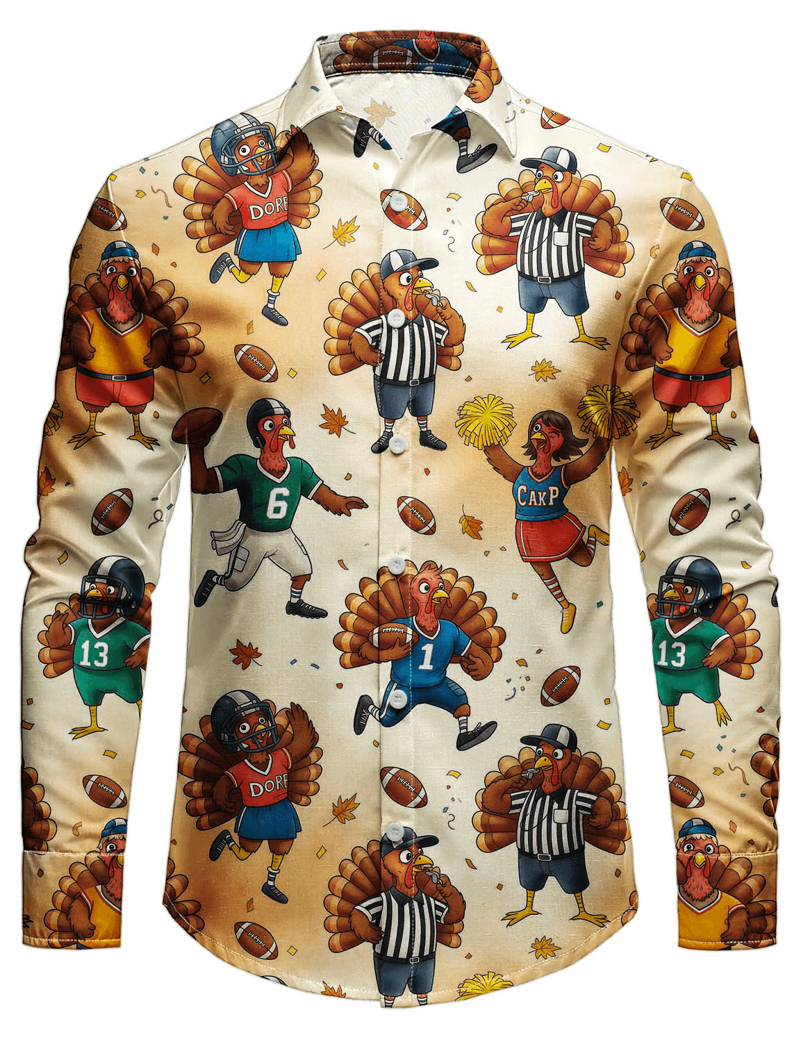 Men's Funny Turkey Print Thanksgiving Holiday Button Up Beige Long Sleeve Shirt