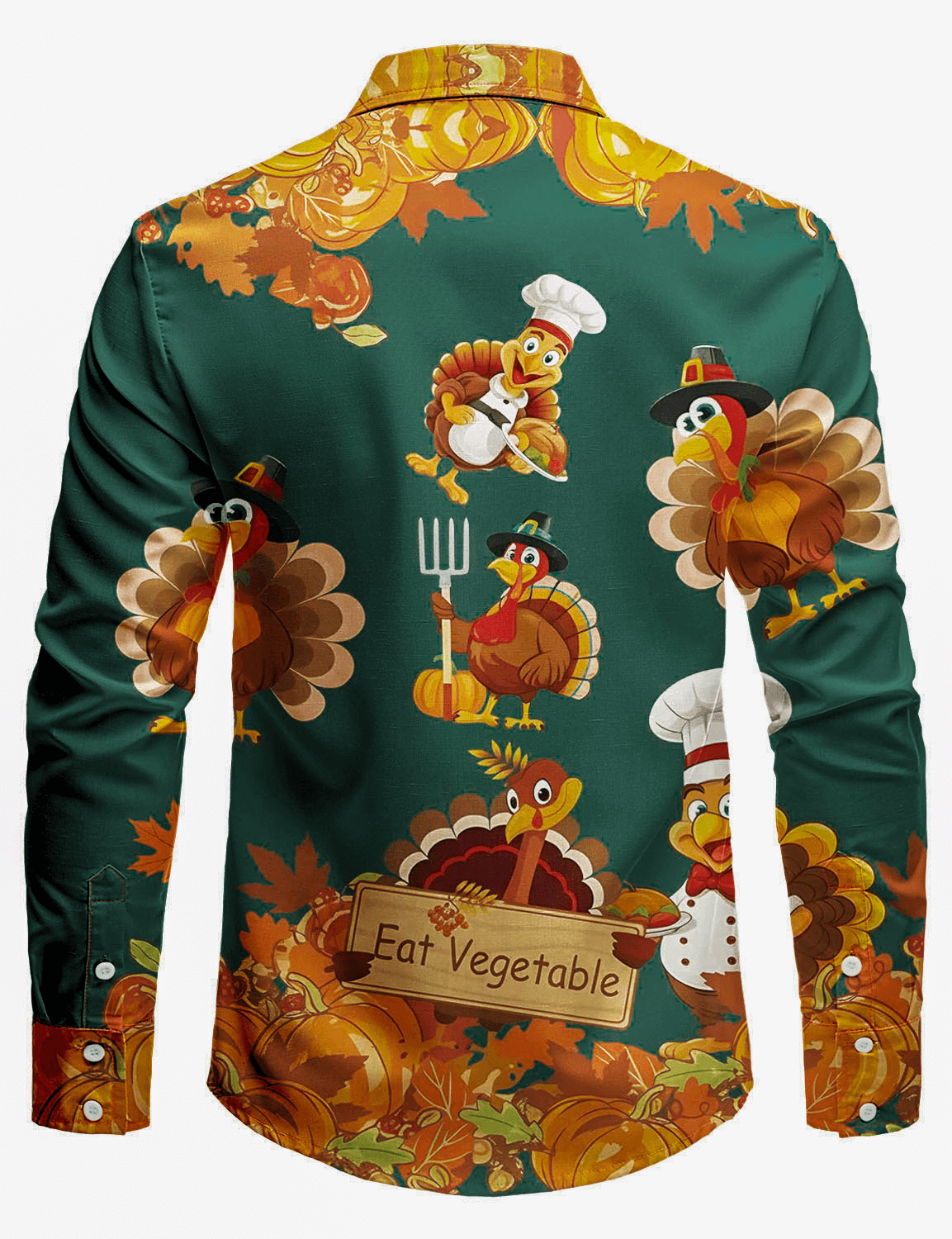 Men's Funny Turkey Print Thanksgiving Holiday Button Up Green Long Sleeve Shirt