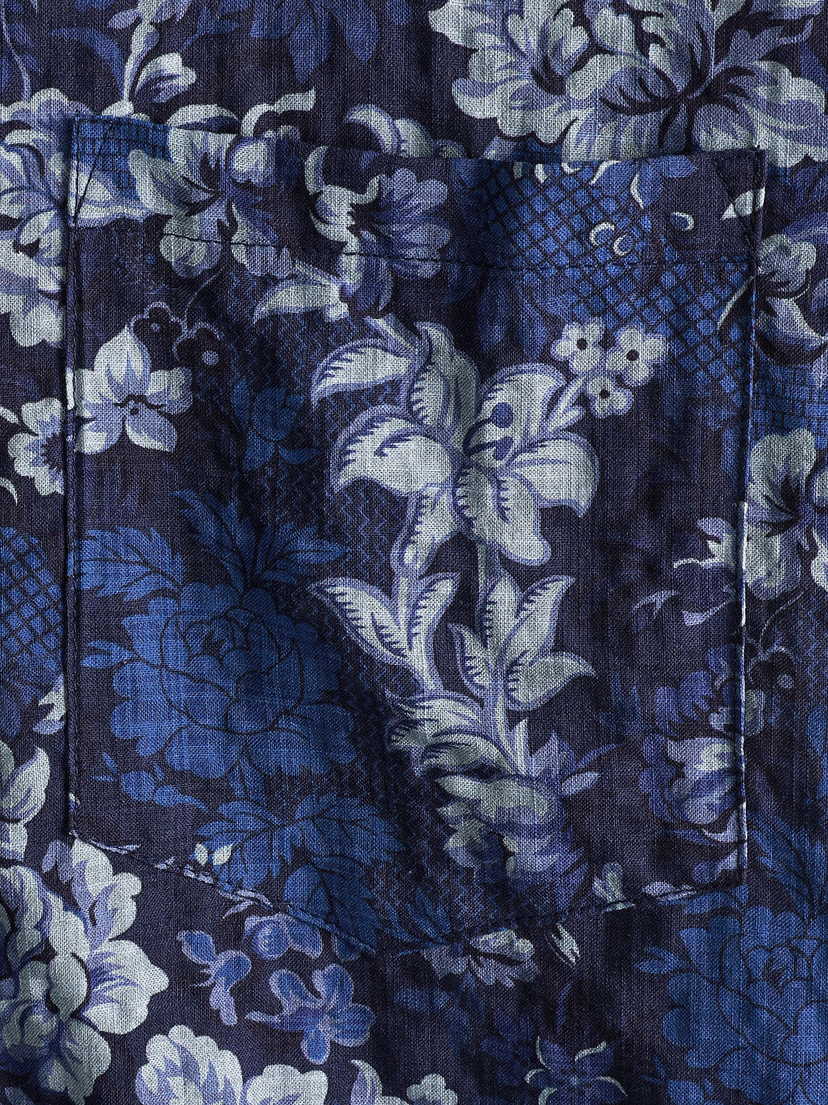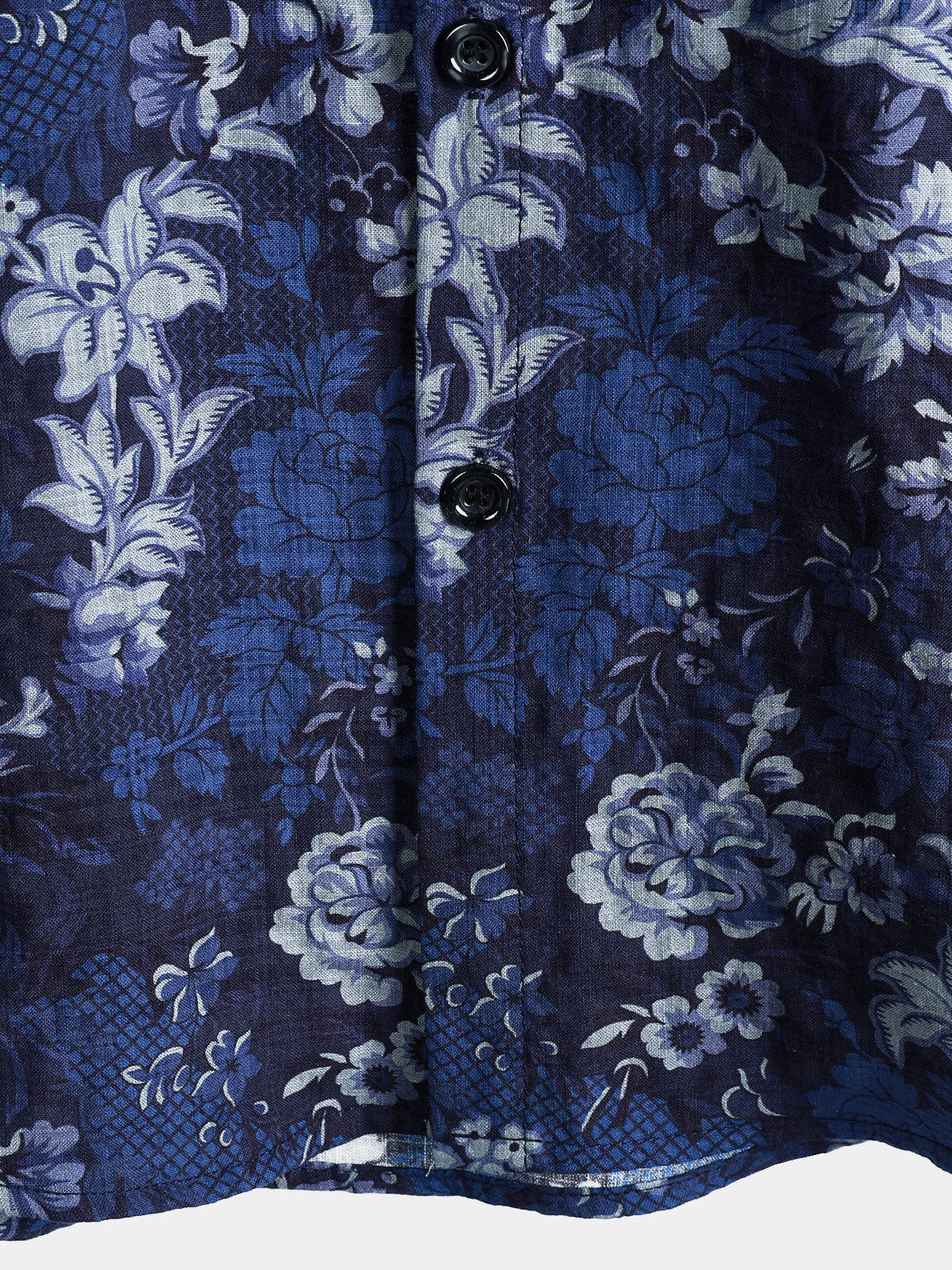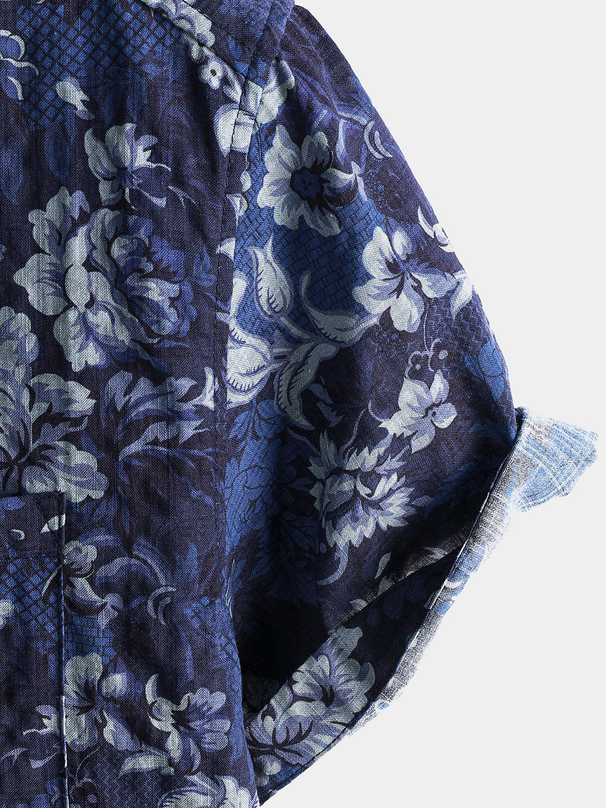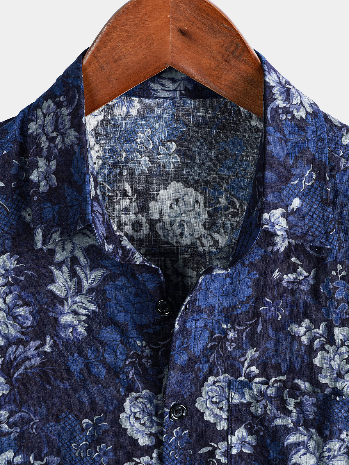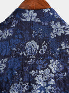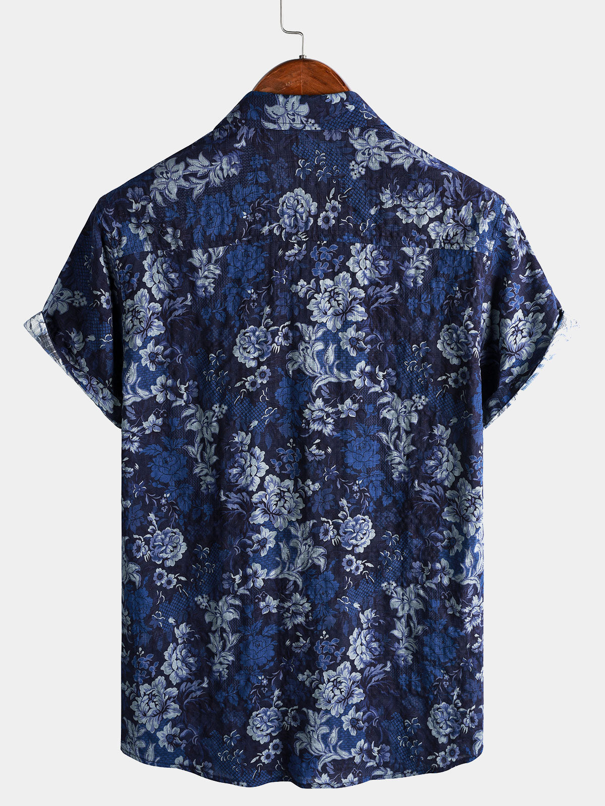 Men's Hawaiian Blue Floral Print Breathable Lightweight Cotton Chest Pocket Short Sleeve Shirt