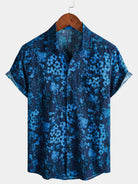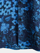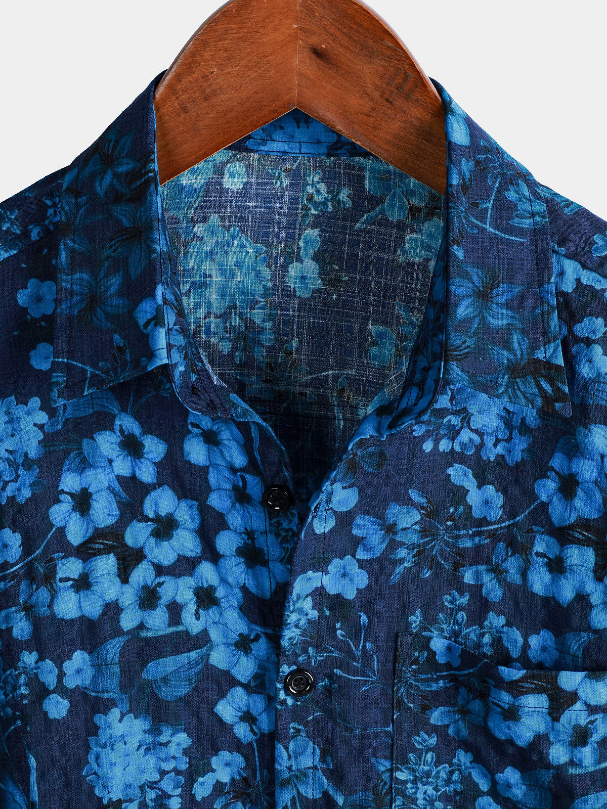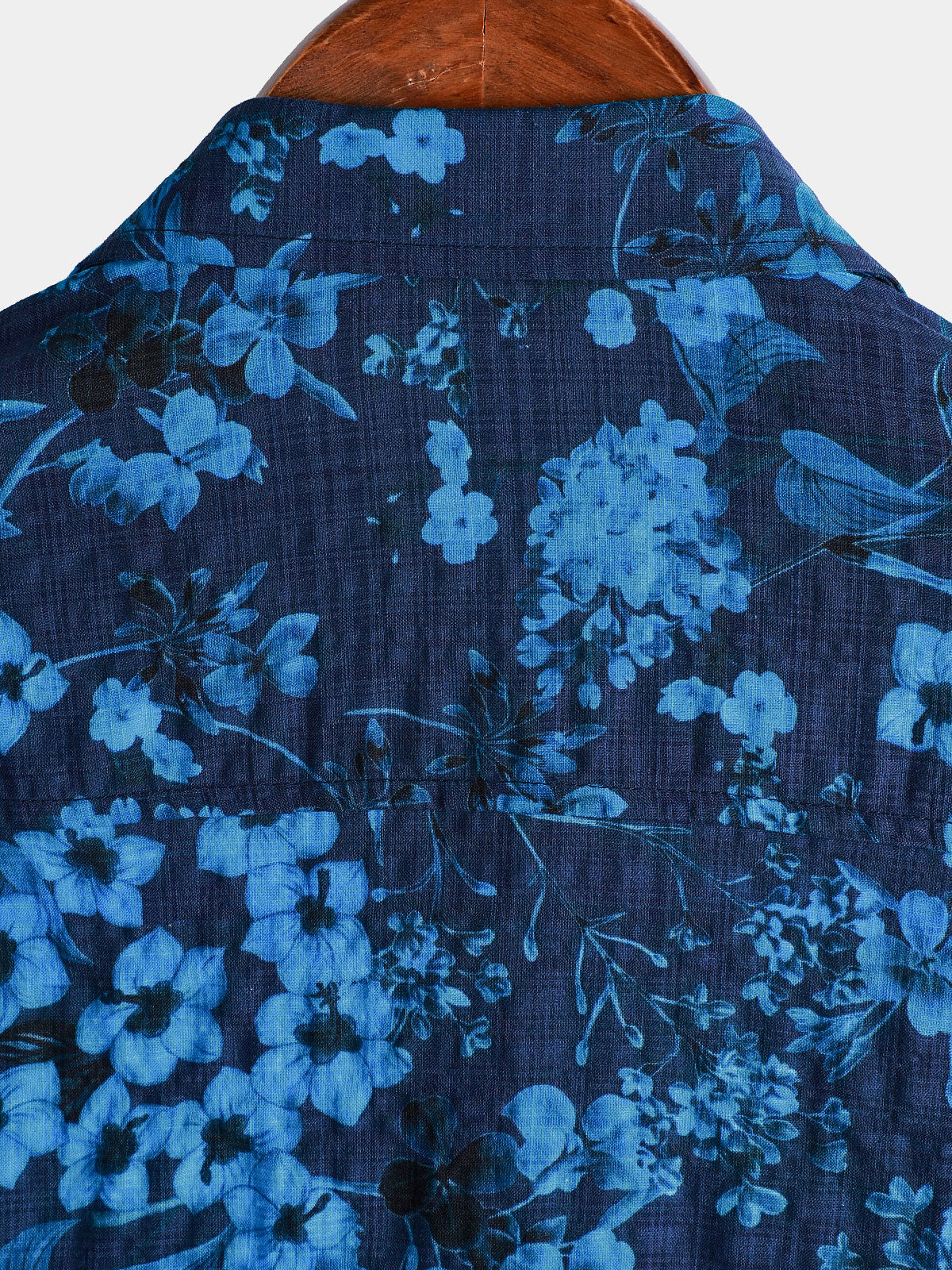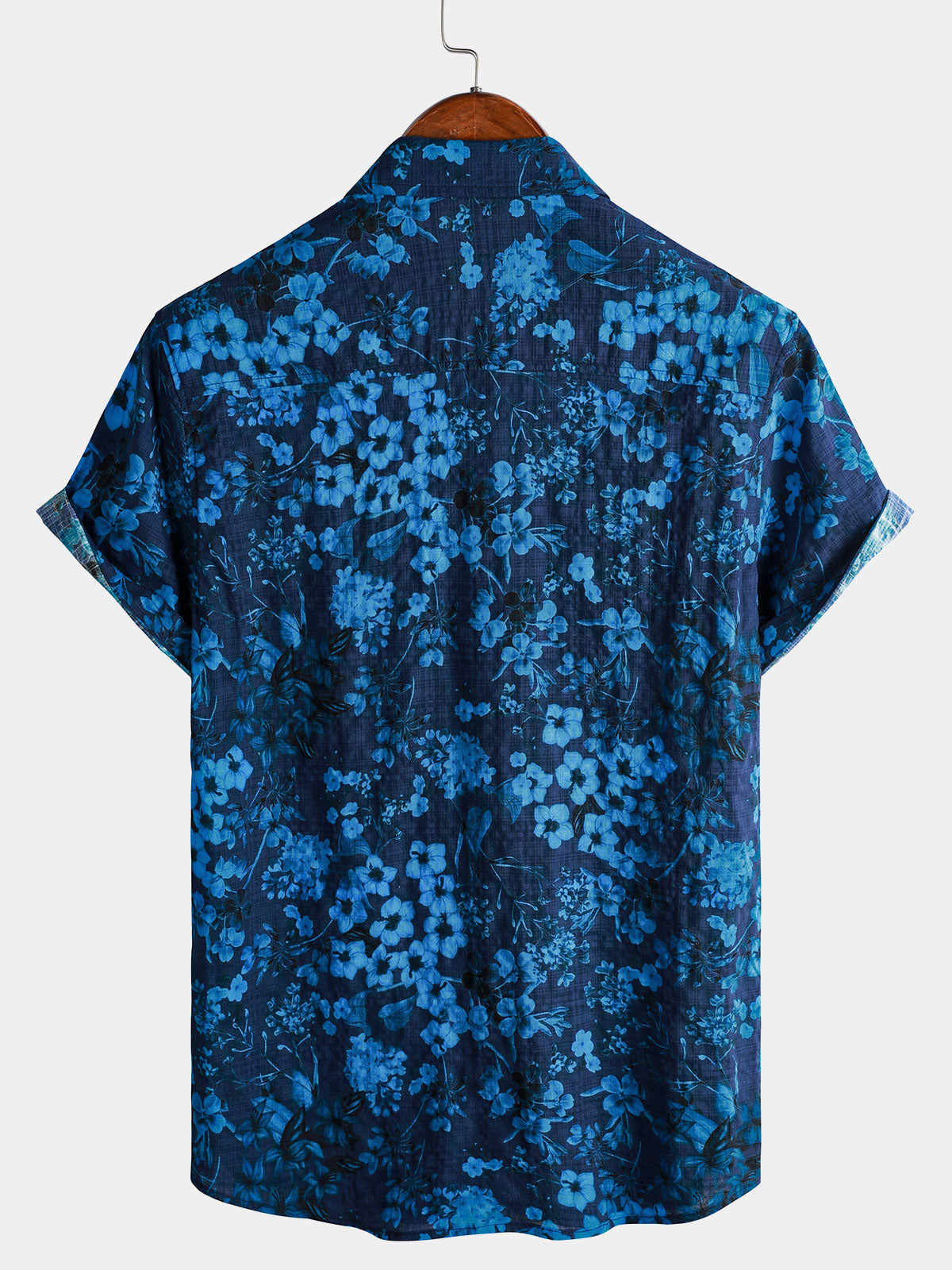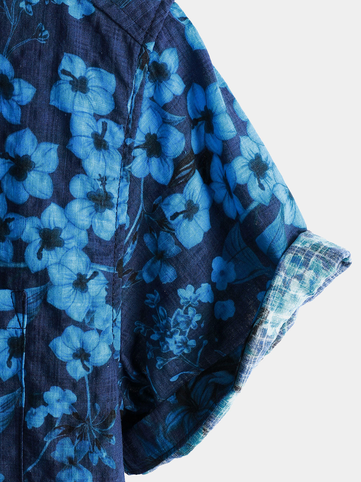 Men's Hawaiian Vintage Dark Blue Floral Print Chest Pocket Short Sleeve Shirt