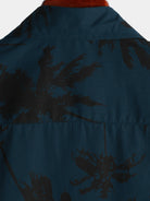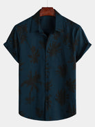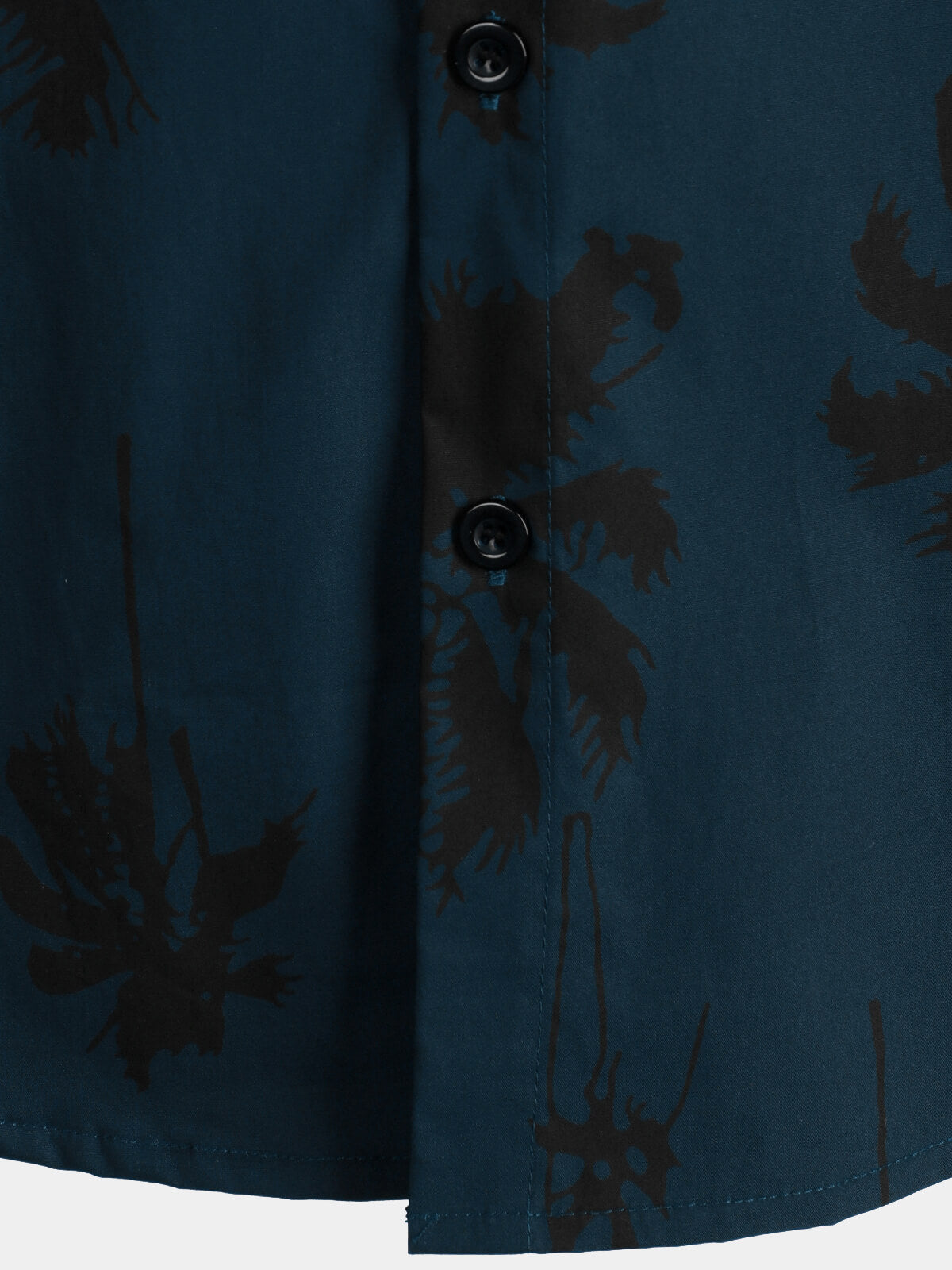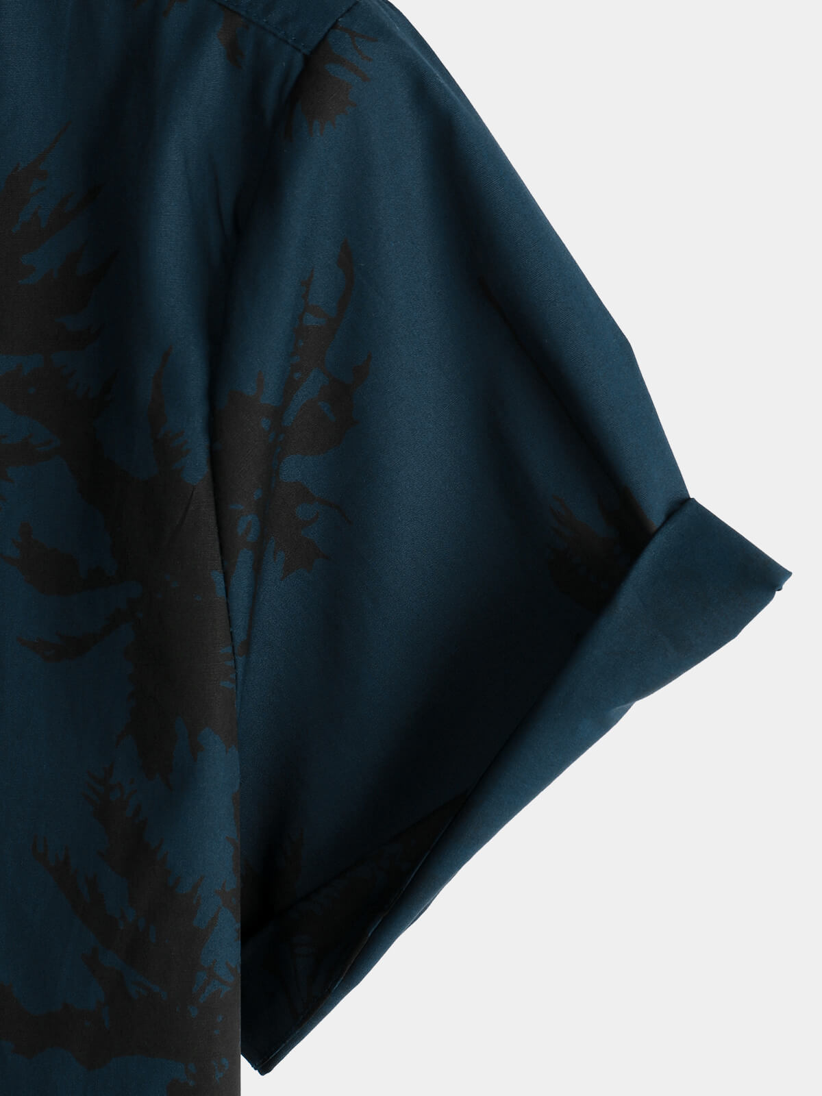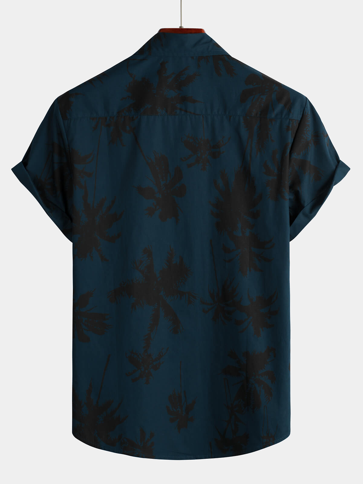 Men's Palm Tree Print 100% Cotton Navy Blue Short Sleeve Hawaiian Collared Shirt
