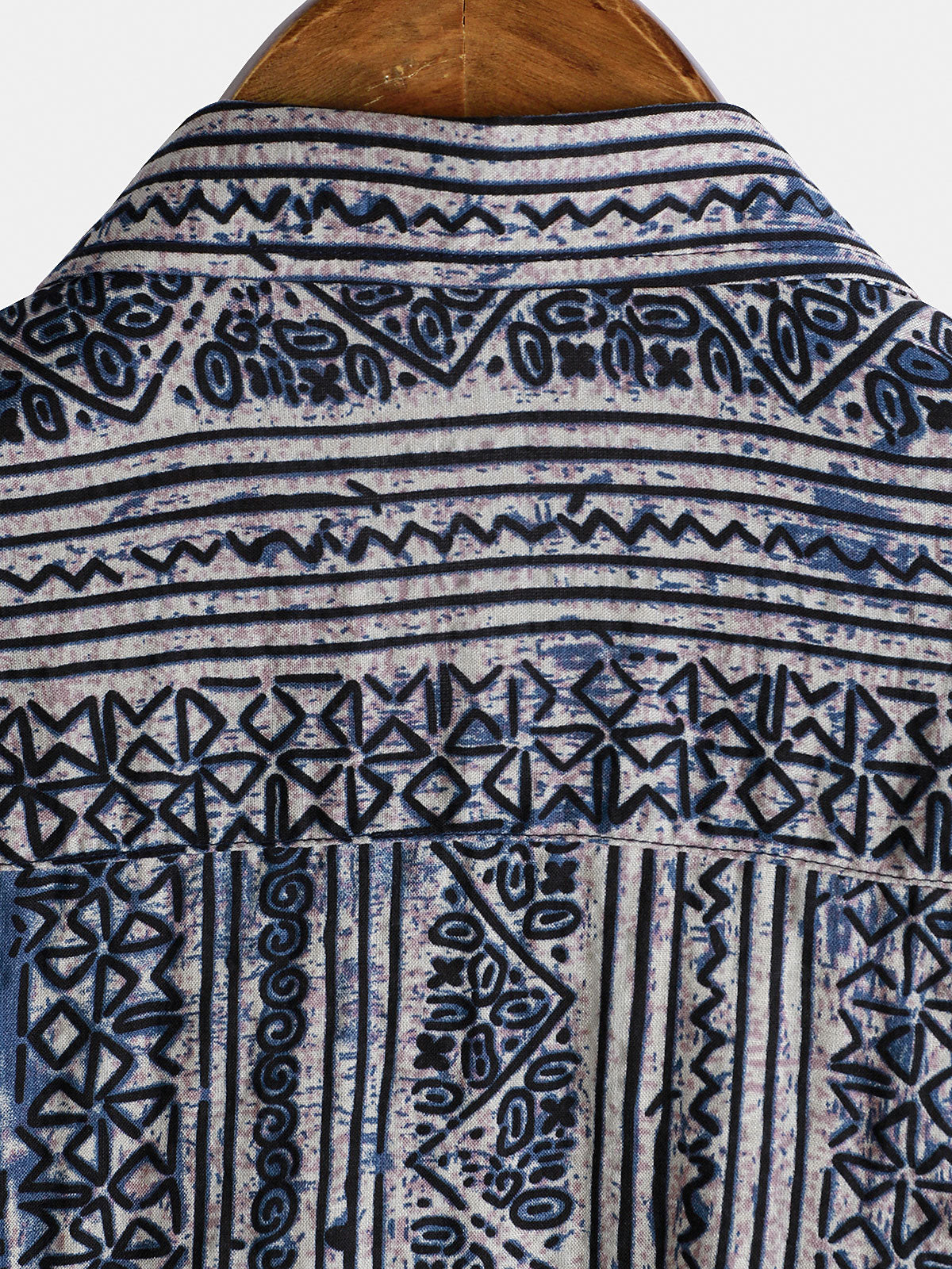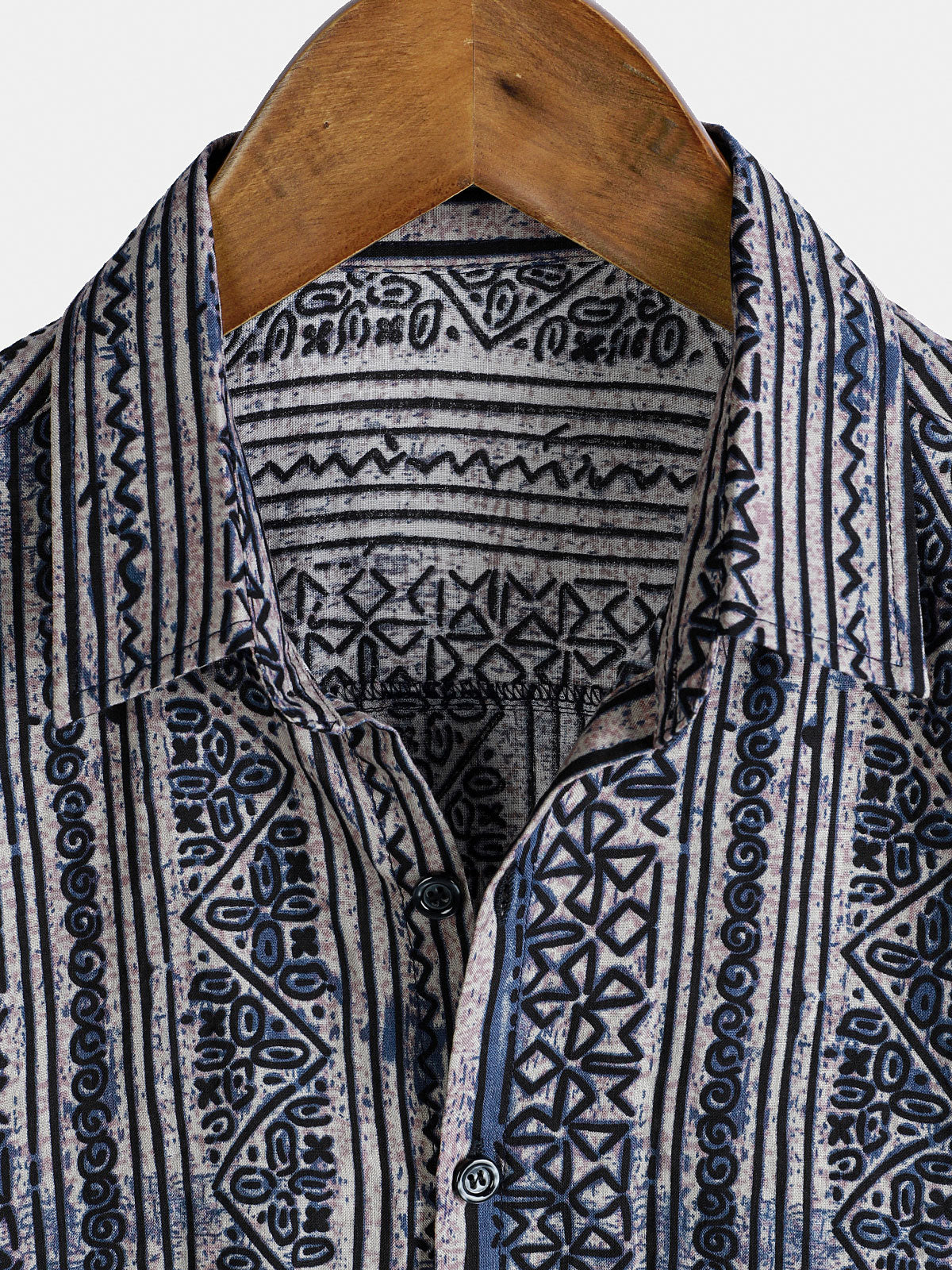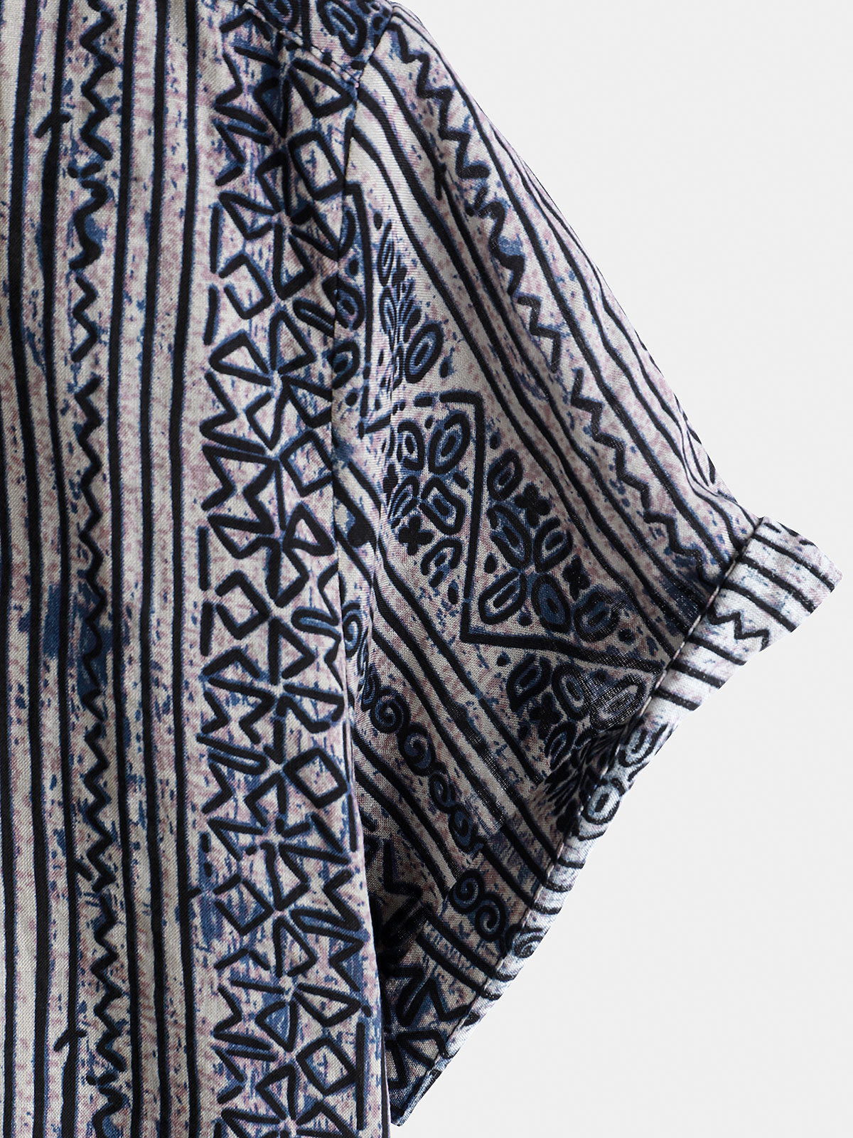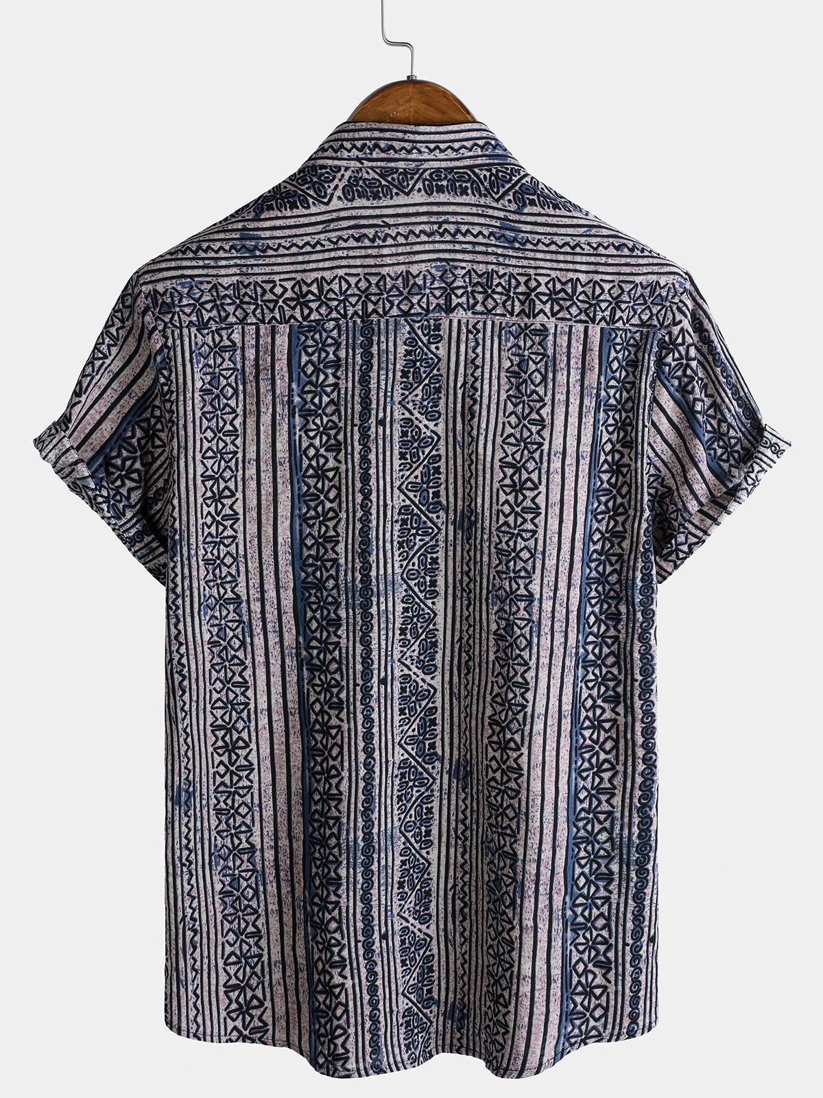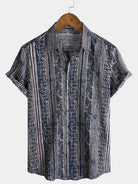 Men's Boho Navy Blue Stripe Print Short Sleeve Shirt