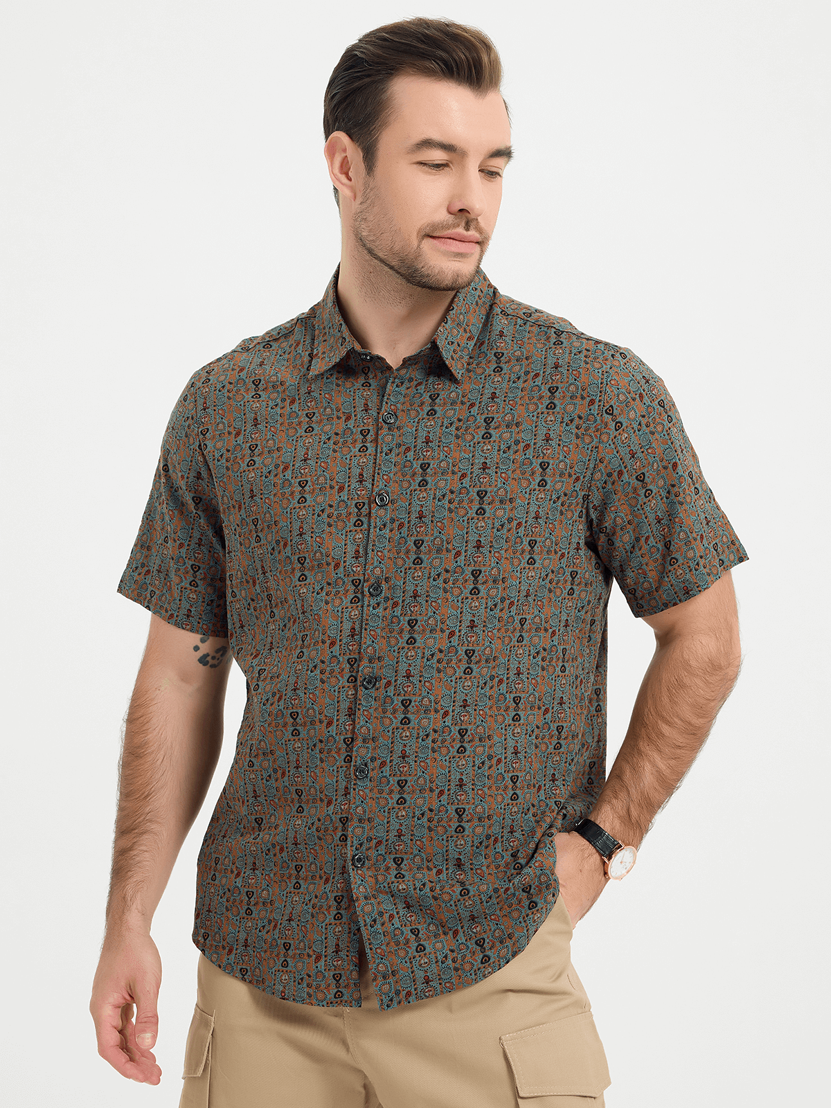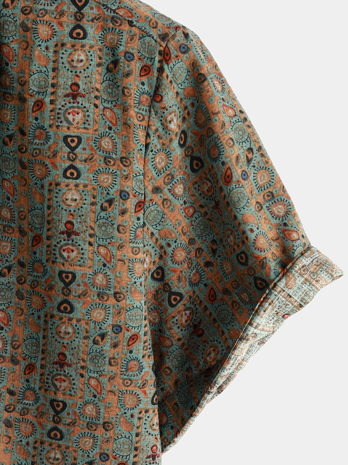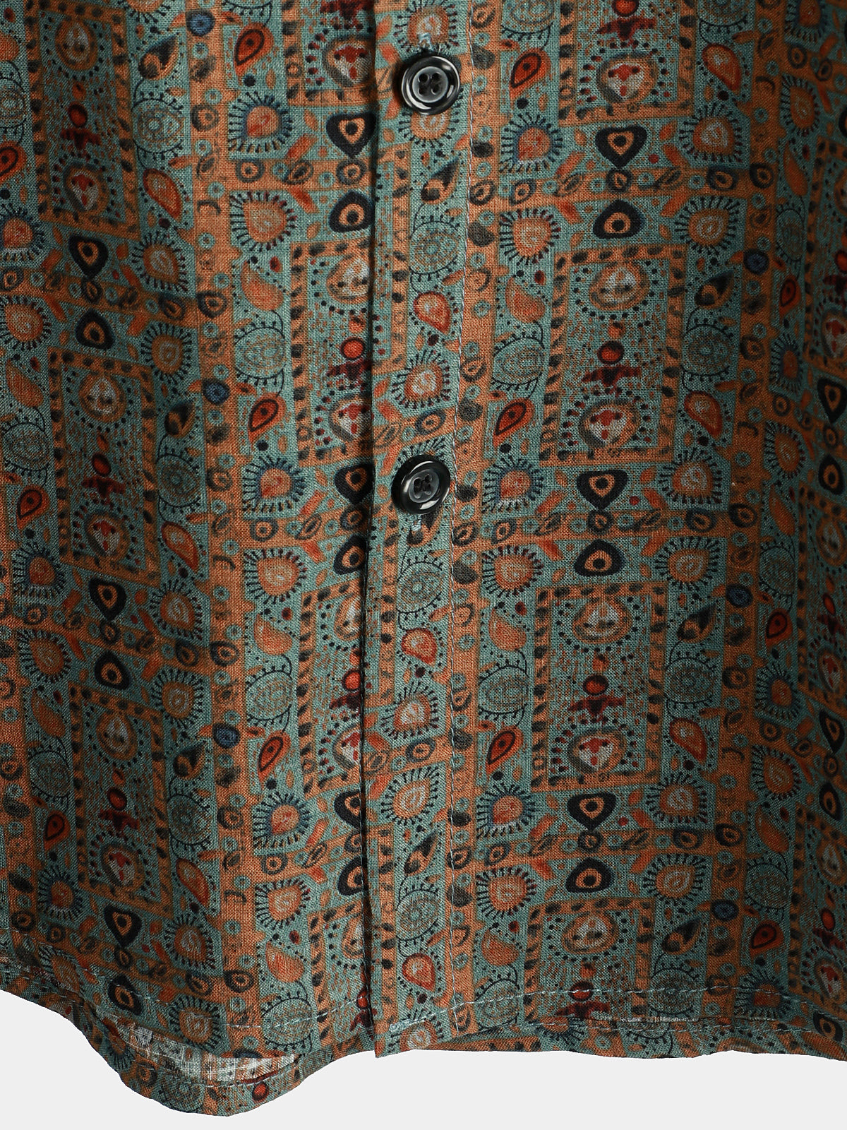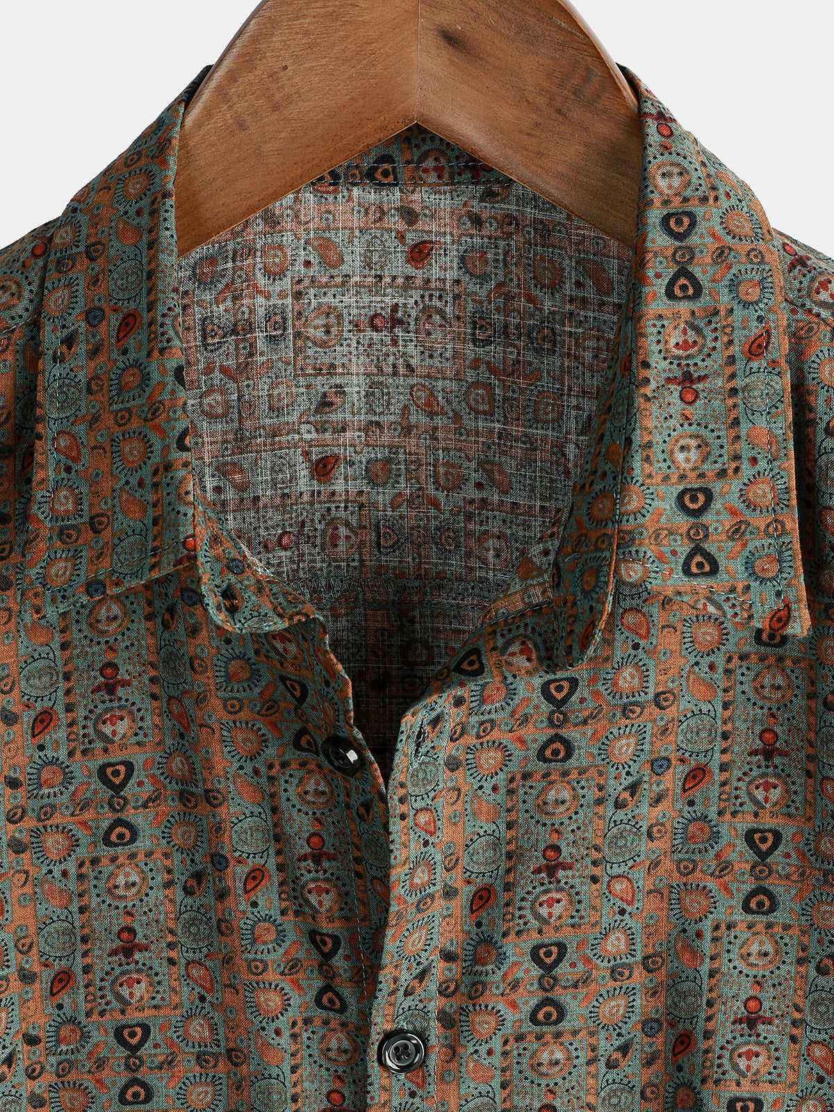 Men's Vintage Paisley Print 70s Button Up Brown Boho Retro Tribal Short Sleeve Shirt