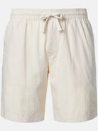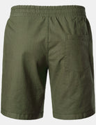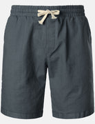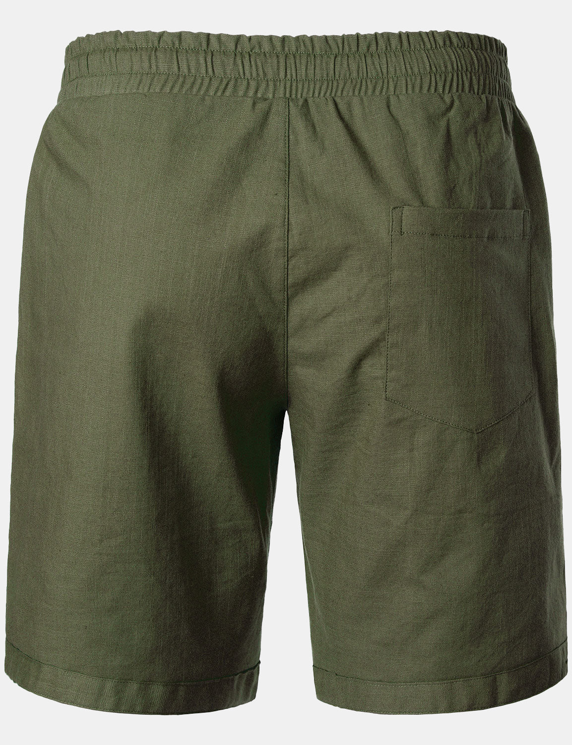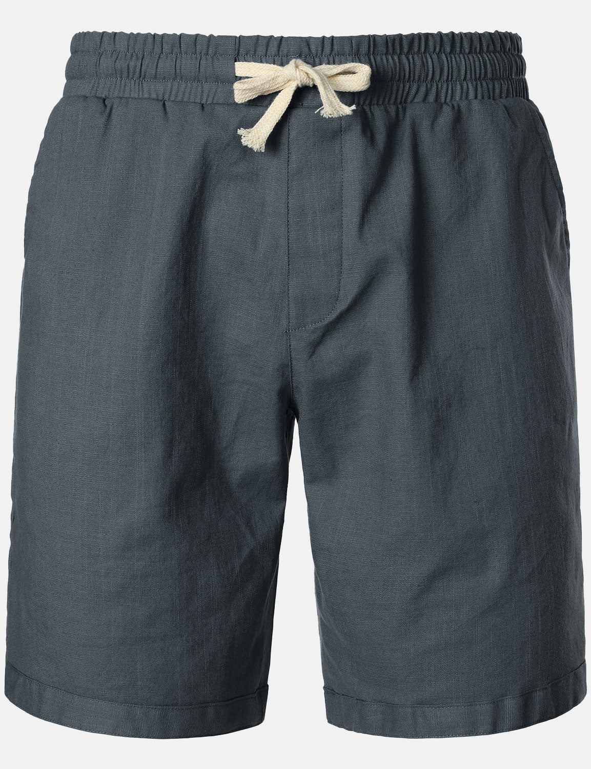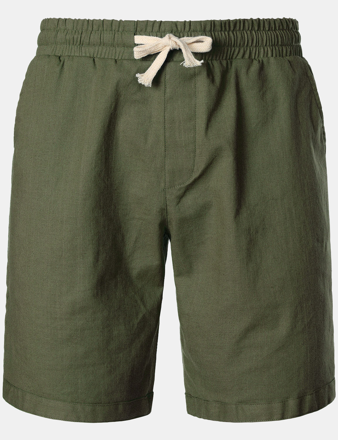 - Flat-front casual shorts with slanted side pockets and rear pockets, mid-rise, elastic waist, and drawstring closure