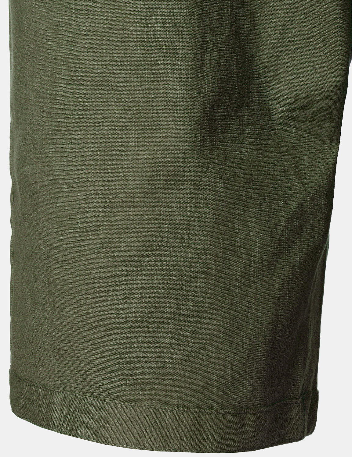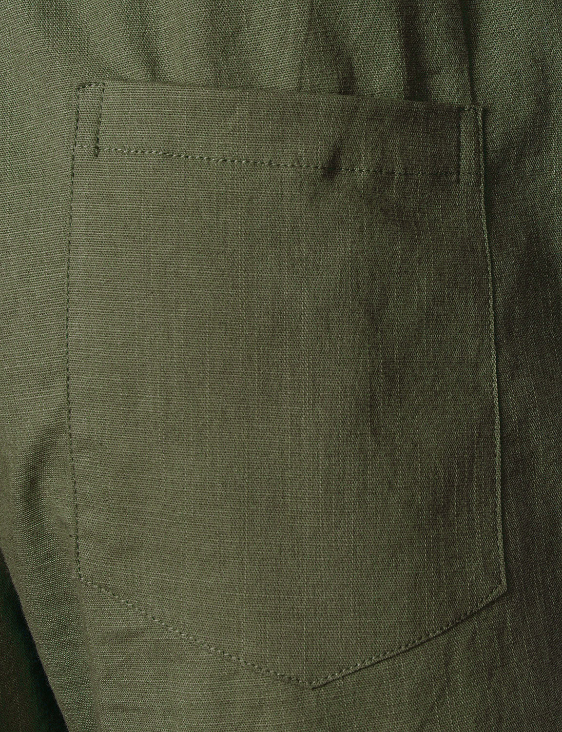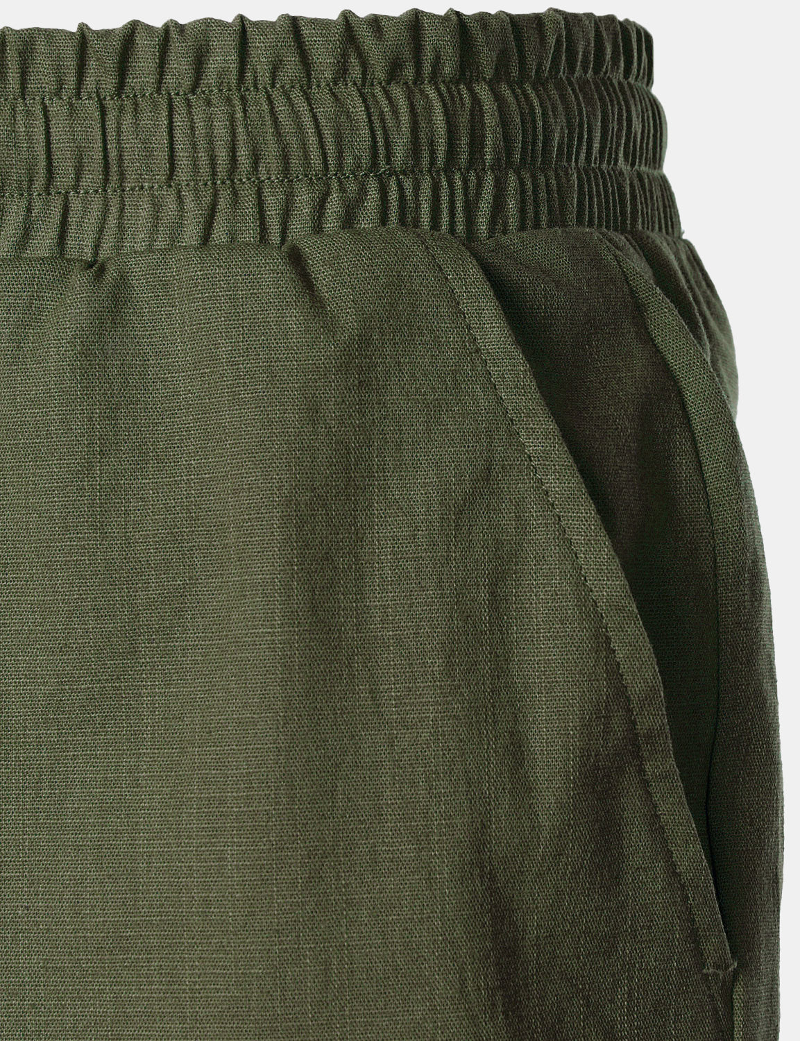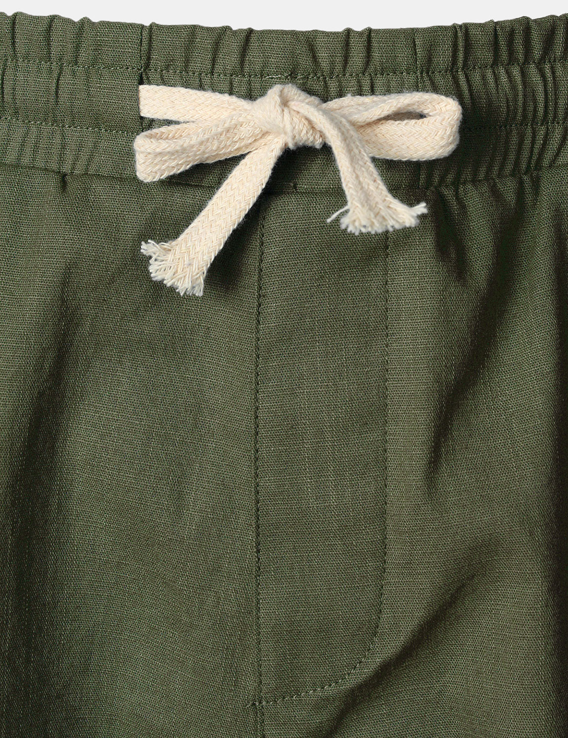 - Flat-front casual shorts with slanted side pockets and rear pockets, mid-rise, elastic waist, and drawstring closure